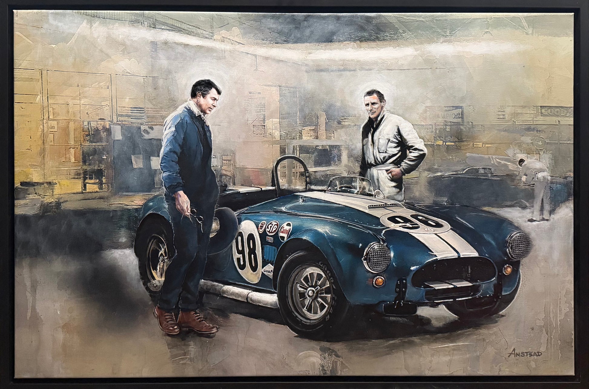 The idea is to take the battle-tested CSX2431 and place it in the new Shelby LAX hangar after they moved shops. The roadster has been in races by now (hence, battle tested). This title also references Ken Miles’ military service in WWII. Carroll is holding sunglasses in one hand and his Stetson hat in the other. Cobra designer John Chun is depicted in the office at the drawing table. 24x36 Acrylics on canvas Preorders of original and print available. Officially licensed product by Carroll Shelby Licensing®