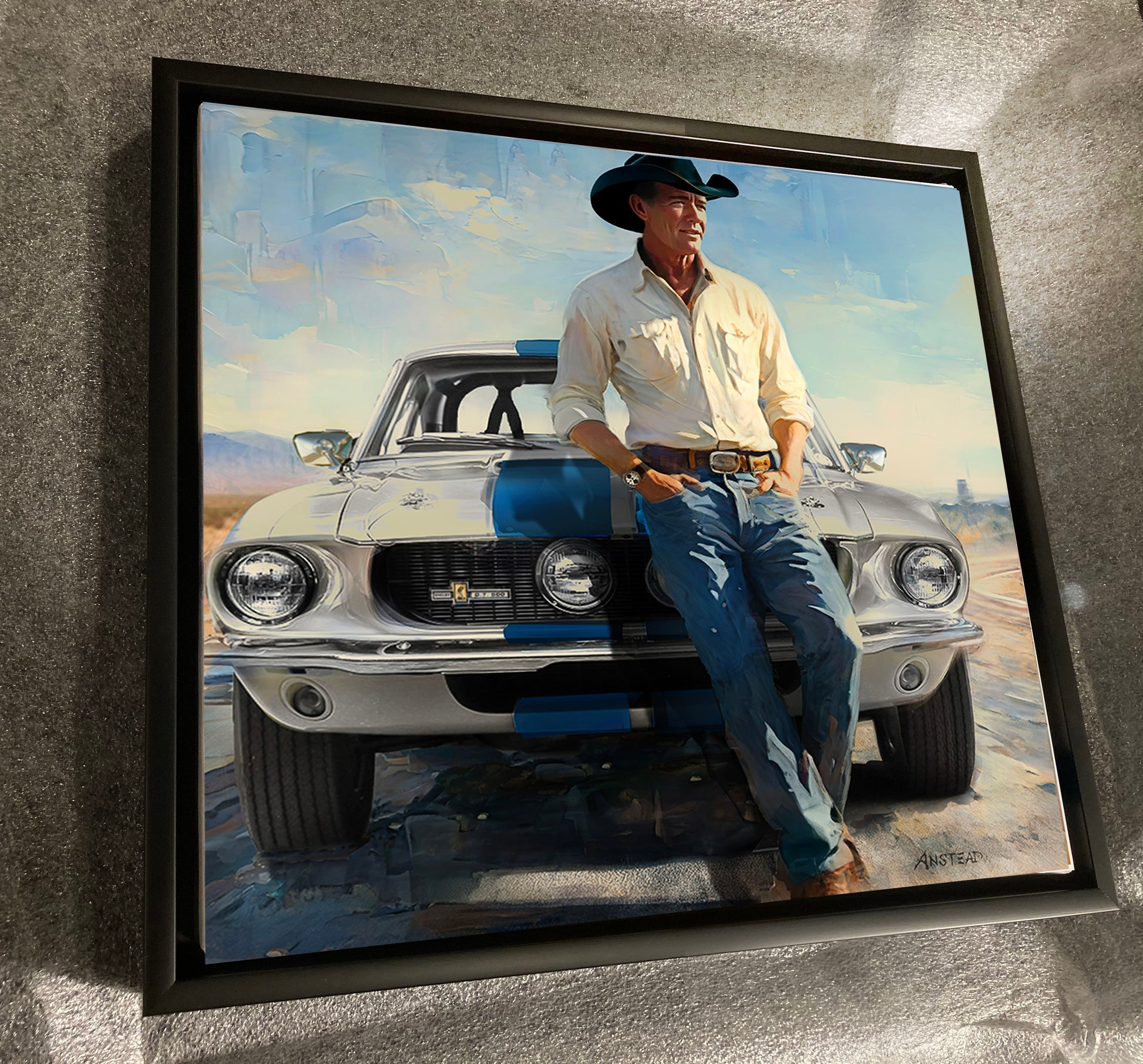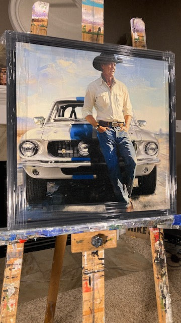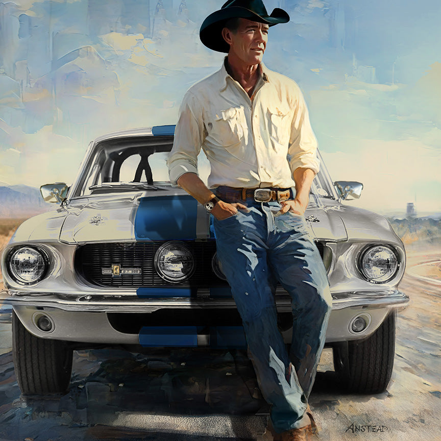 This original work as a tribute piece to the legacy of the 1967 GT500 (meaning that the objective here was to be honorific and not trying to recreate a historic moment). The setting is the Riverside Raceway. Shelby is sporting his signature black cowboy hat and casual clothes. He is also known for wearing fine timepieces, and he is depicted here wearing the special Tag Heuer Carrera Dato 12 ‘Shelby Cobra’ Dial 3147N.